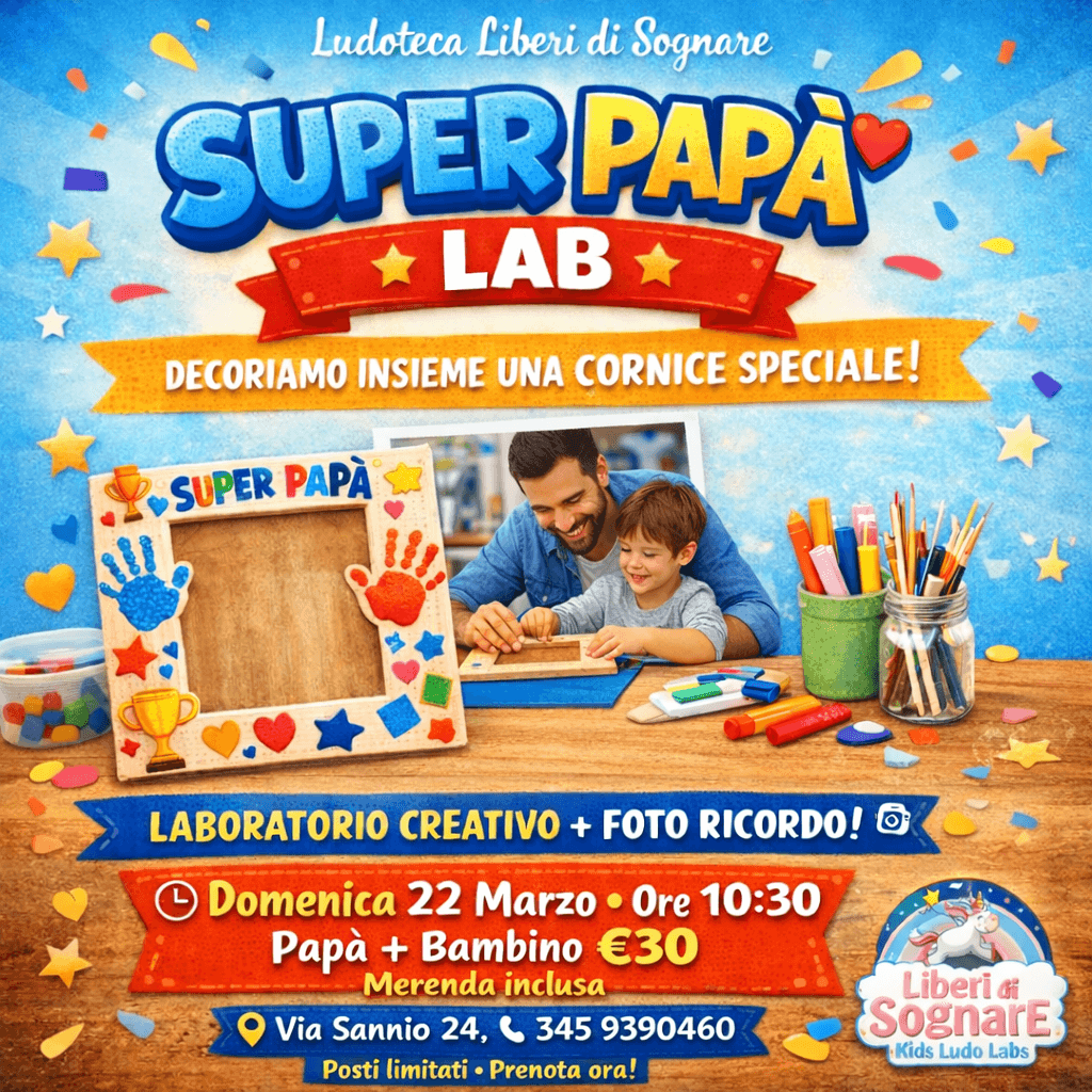 Un laboratorio speciale dedicato alla Festa del Papà: papà e bambini decoreranno insieme una cornice personalizzata, creando un ricordo unico da portare a casa. ✨